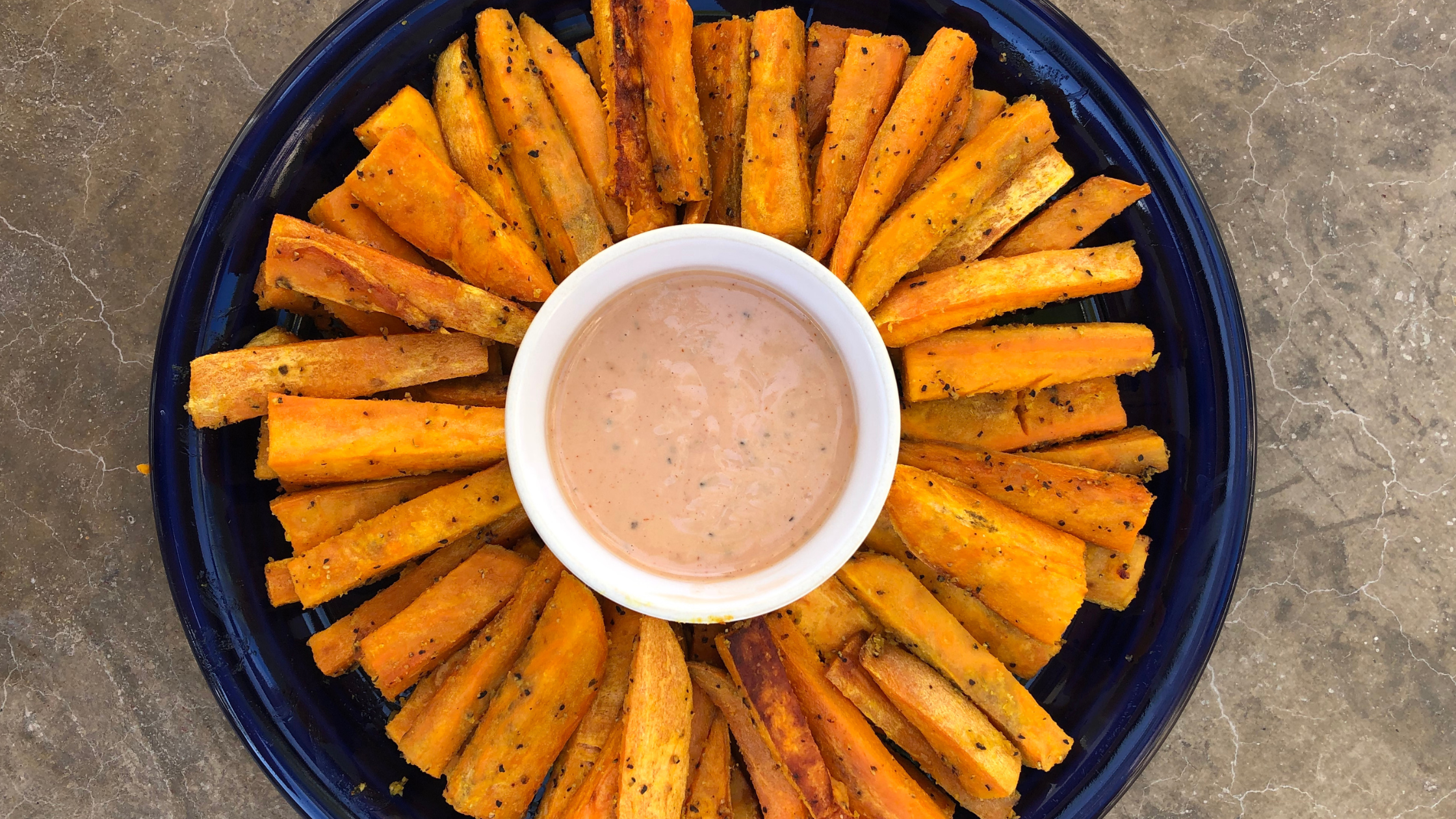 Crispy Sweet Potato Fries with Healthy High Protein Fry Sauce